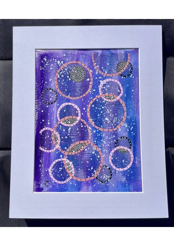 This joyful piece captures the playfulness of bubbles dancing through the air. Bold turquoise and soft black ink detailing float over rich purple hues, creating a sense of movement and lightness.